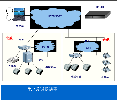 如圖所示,在整個系統(tǒng)中加入“訊時捷™ IPX”系統(tǒng)平臺設(shè)備后,各點之間話費為零。