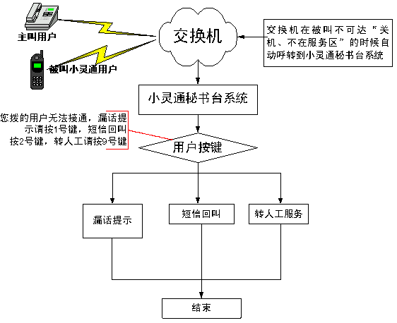 當(dāng)主叫用戶撥打被叫小靈通用戶,而被叫小靈通用戶處于不可達(dá)(關(guān)機(jī)、忙、不在服務(wù)區(qū))狀態(tài)時(shí),該呼叫自動(dòng)轉(zhuǎn)入轉(zhuǎn)到小靈通秘書臺(tái)系統(tǒng)后,用戶選擇短信回叫,系統(tǒng)在被叫小靈通用戶空閑后,會(huì)發(fā)送短信通知主叫用戶,被叫已經(jīng)恢復(fù)狀態(tài),可以呼叫。