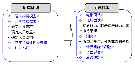 東軟呼叫中心充分挖掘東北地區(qū)豐富的韓語人才資源,通過多種招聘渠道滿足項目的人才需求。東軟自身的教育機(jī)構(gòu)--東軟信息學(xué)院也可以培養(yǎng)專業(yè)的韓語人才,另外,東軟信息學(xué)院與韓國某大學(xué)進(jìn)行戰(zhàn)略合作,通過為韓國留學(xué)生提供呼叫中心實習(xí)機(jī)會及漢語培訓(xùn)等,方式,吸引數(shù)名高素質(zhì)韓國大學(xué)生加入呼叫中心,充分滿足該項目對專業(yè)人才的需求。