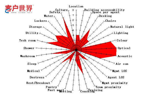 在“環(huán)境”類別之下,包括了與座席代表身心健康、工作便利性和管理有效性有關(guān),體現(xiàn)呼叫中心物理特征的30多個子項。圖三顯示的就是某個假想呼叫中心的環(huán)境星狀圖。