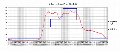 要用EXCEL畫這樣的比較圖,其實不難。因為平日和假日的電話量模型不一樣,所以一般會畫兩張,一張是平日的電話量和人力比較,一張是假日的電話量和人力比較。下面就是一張平日的電話量和人力比較圖,一天24小時的情況。紅色的是每隔15分鐘的電話量,藍色的是實際安排的人力。