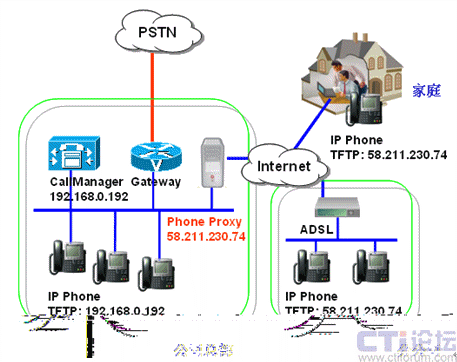 PCS的PhoneProxy是一套軟件,只要在中心CallManager站點安裝一套PhoneProxy,就能實現任何能上網的地方,IP電話都能通過廣域網注冊,不需要任何VPN設備。