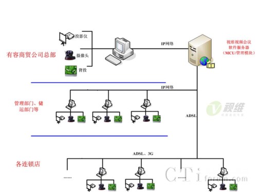 有容商貿(mào)大規(guī)模網(wǎng)絡(luò)遠(yuǎn)程會(huì)議和培訓(xùn)系統(tǒng)由服務(wù)器端和客戶端組成,服務(wù)器端軟件部署在公司中心機(jī)房,中心機(jī)房配置1臺(tái)單獨(dú)服務(wù)器,支持400個(gè)客戶端同時(shí)在線,負(fù)責(zé)所有會(huì)議和培訓(xùn)的召集、音視頻交互、加密等工作,有容商貿(mào)各部門(mén)、轄下各連鎖店通過(guò)WEB方式(包括ADSL、3G無(wú)線等多種網(wǎng)絡(luò))即可實(shí)現(xiàn)客戶端軟件的自動(dòng)安裝與升級(jí),配備簡(jiǎn)單的攝像頭和話筒之后就可以實(shí)現(xiàn)有容商貿(mào)以及連鎖店的大規(guī)模工作會(huì)議和高清音視頻網(wǎng)絡(luò)培訓(xùn)。網(wǎng)絡(luò)拓?fù)鋱D如下: