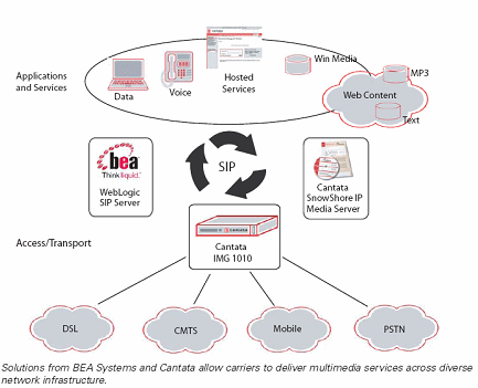 BEA提供領先的SOA基礎架構,同時它還提供可以在即使是完全不同的IT環(huán)境中建立應用和管理SOA的強大的、 基于標準的平臺。BEA WebLogic Communications Platform (WebLogic 通信平臺)是第一個提供在運營商級環(huán)境中、全業(yè)務功能的融合IT和電信的平臺。它使得運營商可以通過加強利用固網(wǎng)和無線網(wǎng)開展多樣的數(shù)字內容和視頻服務的能力,從而增加收入。其WebLogic SIP 服務器提供了必需的呼叫建立和會話管理,但是,運營商仍然需要高級的媒體處理能力,以及能夠與BEA 解決方案進行互操作的標準接口,從而使得運營商可以提供可擴展的語音、視頻和多媒體服務。他們同時需要有媒體網(wǎng)關以實現(xiàn)跨網(wǎng)絡的連接。Cantata與BEA Systems 合作,提供與BEA的WebLogic SIP服務器可靠的交互操作性,同時,運營商可以利用Cantata的SnowShore IP媒體服務器以及集成媒體網(wǎng)關1010實現(xiàn)跨固網(wǎng)和無線網(wǎng)語音和多媒體服務。