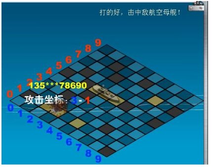 這里是游戲的主戰(zhàn)場(chǎng),觀眾每發(fā)送一個(gè)轟炸坐標(biāo)過(guò)來(lái),都會(huì)在這里有體現(xiàn)。如轟炸者的手機(jī)號(hào)、攻擊坐標(biāo)、是否擊中(擊中是一團(tuán)火光,未擊中則是水花)、及語(yǔ)音及文字提示。