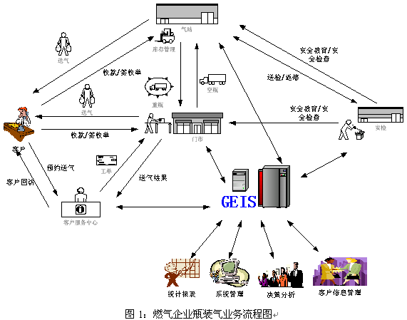 GEIS燃?xì)膺\(yùn)營(yíng)管理信息系統(tǒng)的應(yīng)用是企業(yè)的長(zhǎng)期發(fā)展的驅(qū)動(dòng)力,它是一套以客戶服務(wù)接觸中心為龍頭、以運(yùn)營(yíng)生產(chǎn)流程管理為龍身、以經(jīng)營(yíng)分析為龍尾的閉環(huán)信息處理系統(tǒng)。它由客戶服務(wù)中心子系統(tǒng)、門市業(yè)務(wù)子系統(tǒng)、氣站管理子系統(tǒng)、安全搶修平臺(tái)和管理與集成模塊組成。實(shí)踐的事實(shí)告訴我們,它起到保持客戶忠誠(chéng)度、提升企業(yè)品牌影響力、提高業(yè)務(wù)運(yùn)作效率、加快業(yè)務(wù)經(jīng)營(yíng)決策和促進(jìn)企業(yè)持續(xù)發(fā)展的作用。