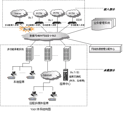 VAN(Voice Area Network)是一個支持多接入點、多承攬點、多業(yè)務點、多數(shù)據(jù)點的大型分布式呼叫中心構造平臺。它針對大型分布式呼叫中心、企業(yè)營銷網(wǎng)絡及行業(yè)公共交換平臺的業(yè)務需求和技術需求開發(fā),支持多種接入方式并具備多種服務處理手段,同時可利用其軟件平臺——DCCMS呼叫管理系統(tǒng)對多種業(yè)務進行分散式管理,對各類資源進行統(tǒng)一控制,實現(xiàn)全網(wǎng)數(shù)據(jù)協(xié)同管理。