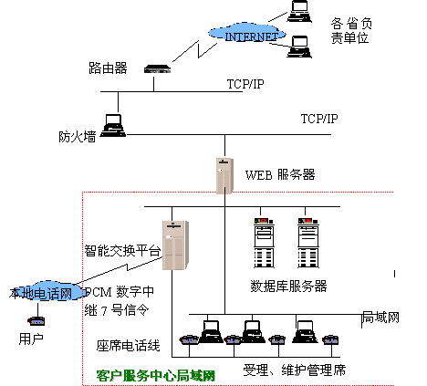 數(shù)據(jù)通信局的客戶遍布全國(guó)各地,建立一個(gè)覆蓋全國(guó)的客戶服務(wù)網(wǎng)絡(luò)勢(shì)在必行,因此我公司為之構(gòu)建了數(shù)據(jù)通信局客戶服務(wù)系統(tǒng),全國(guó)各地的各個(gè)客服中心的數(shù)據(jù)可以通過專線連接,語(yǔ)音也可以通過VOIP用數(shù)字專線連接,以降低長(zhǎng)話費(fèi)用。該系統(tǒng)的投入使用,不但滿足了數(shù)據(jù)局為全國(guó)各地客戶服務(wù)的需要,而且可以收集客戶信息,不但降低了辦公費(fèi)用,而且有利于擴(kuò)大市場(chǎng)分額。數(shù)據(jù)通信客戶服務(wù)中心的主要目的是解決對(duì)全國(guó)大客戶的業(yè)務(wù)咨詢與申辦、障礙申告、投訴與建議的集中管理以及處理控制,系統(tǒng)采用800號(hào)接入,以一個(gè)小型的交換設(shè)備為座席電話分配點(diǎn),客戶撥入的電話,經(jīng)小型交換設(shè)備分配到空閑的座席上。