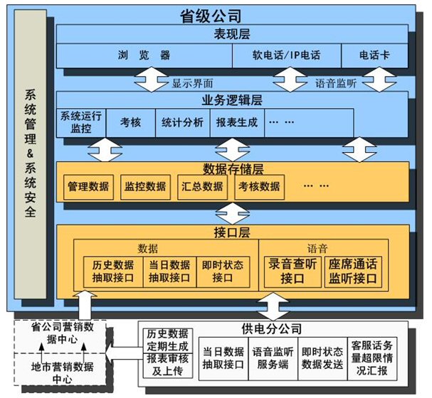 該系統(tǒng)主要功能是對(duì)各地市的95598客戶服務(wù)中心系統(tǒng)進(jìn)行數(shù)據(jù)采集、監(jiān)聽各地座席通話、查詢各地系統(tǒng)的工作情況、進(jìn)行業(yè)務(wù)培訓(xùn)、統(tǒng)計(jì)各地工作情況。