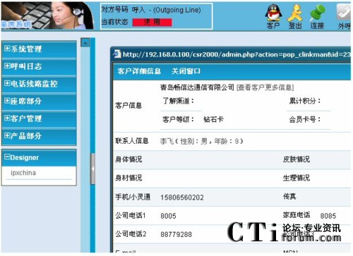 作為呼叫中心的核心功能,來(lái)電彈屏功能在客戶(hù)和服務(wù)代表之間建立了溝通的橋梁。當(dāng)電話(huà)接入客服代表電話(huà)振鈴的同時(shí),電腦屏幕會(huì)彈出客戶(hù)的相關(guān)資料。如果是新客戶(hù),則彈出空白頁(yè)面,客服代表可以說(shuō)歡迎的同時(shí)錄入客戶(hù)資料,以備客戶(hù)下次來(lái)電時(shí)查詢(xún)。當(dāng)客戶(hù)在網(wǎng)上選購(gòu)產(chǎn)品時(shí),有問(wèn)題可以隨時(shí)打電話(huà)溝通,來(lái)時(shí)的同時(shí),座席電腦上彈出客戶(hù)已經(jīng)填寫(xiě)的資料,座席對(duì)客戶(hù)的資料一目了然,提高了工作效率。來(lái)電彈屏的頁(yè)面可以根據(jù)用記要求定制。