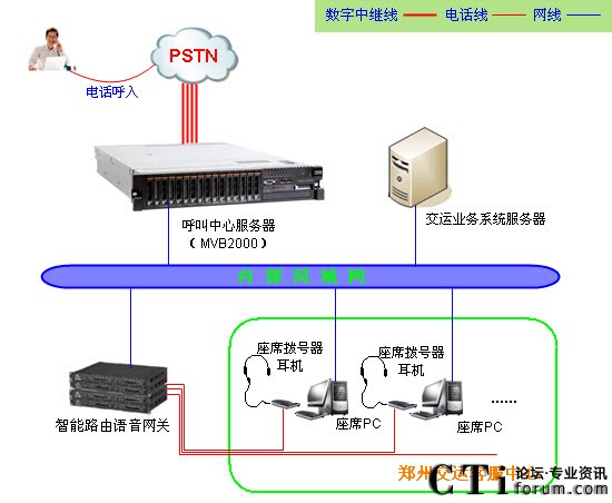 鄭州交運(yùn)服務(wù)熱線采用暢信達(dá)通信MVB2000系統(tǒng)作為交換平臺,采用企業(yè)級智能路由語音網(wǎng)關(guān)結(jié)合話機(jī)作為座席終端,系統(tǒng)共接入數(shù)字中繼線4條(4E1),座席分機(jī)90臺,系統(tǒng)通過內(nèi)部局域網(wǎng)組網(wǎng),系統(tǒng)架構(gòu)形式如下: