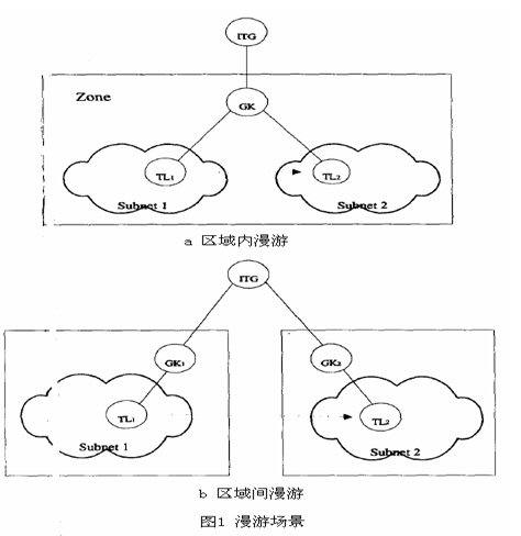 H.323定義中,區(qū)域指由H.323實(shí)體(終端、ITG、MCU)組成的集合,并由一個(gè)網(wǎng)守進(jìn)行管理。每一個(gè)區(qū)域只有一個(gè)網(wǎng)守,但允許多個(gè)子網(wǎng)通過路由器連接進(jìn)來(lái)。對(duì)于這種多子網(wǎng)單網(wǎng)守的特性,我們發(fā)現(xiàn)這與GSM系統(tǒng)中的服務(wù)區(qū)類似,網(wǎng)守就相關(guān)于HLR或者VLR。服務(wù)區(qū)中有移動(dòng)電話終端和代理管理下的基站,類似的一個(gè)區(qū)域中有多個(gè)子網(wǎng)并都在一個(gè)網(wǎng)守的管理下。當(dāng)移動(dòng)IP電話從一個(gè)子網(wǎng)漫游到另外一個(gè)子網(wǎng)時(shí),IP電話的IP地址就發(fā)生了變化。如果不做移交處理的話,連接將中斷。