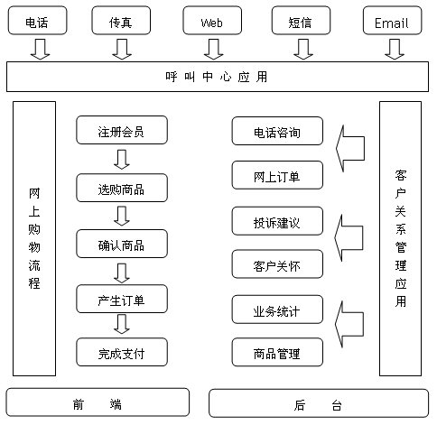 依照我公司的建設(shè)方向,中小型網(wǎng)上購物平臺的客戶服務(wù)呼叫中心系統(tǒng)應(yīng)具備呼叫中心的基本功能,同時(shí)融入了網(wǎng)上購物的客戶關(guān)系管理(CRM)流程,因此,它是呼叫中心與CRM系統(tǒng)的有機(jī)結(jié)合體,包含電話咨詢、網(wǎng)上訂單、客戶關(guān)懷等主要功能層的應(yīng)用。