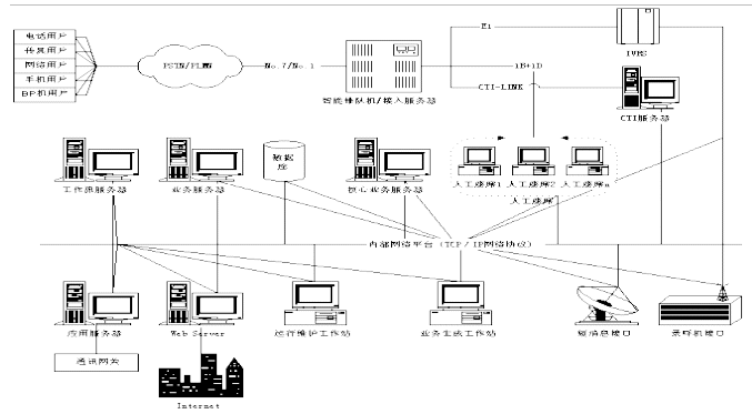 客戶服務(wù)中心系統(tǒng)包含智能排隊(duì)機(jī)(含接入服務(wù)器)、核心服務(wù)器CCS、交互式語(yǔ)音應(yīng)答系統(tǒng)IVR、語(yǔ)音傳真服務(wù)器、業(yè)務(wù)服務(wù)器、工作流服務(wù)器、數(shù)據(jù)庫(kù)服務(wù)器、Internet/Intranet服務(wù)器、人工座席、尋呼機(jī)接口,手機(jī)短消息接口等組成。如下圖所示為Runsun呼叫中心系統(tǒng)結(jié)構(gòu)圖: