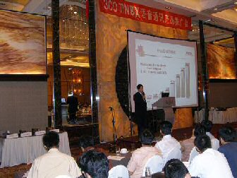 。。2005年8月24日,3Com NBX語音通訊產(chǎn)品推廣會于北京香格里拉大酒店成功舉辦。圖為3Com中國地區(qū)高級市場經(jīng)理朱海翔闡述3Com產(chǎn)品與市場(點擊察看大圖)