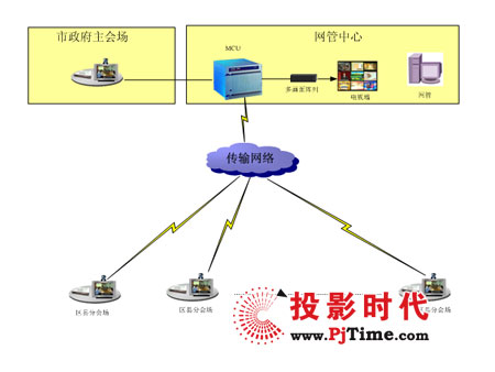 傳輸網(wǎng)絡采用4M專線,整個系統(tǒng)由控制中心、市政府主會場和18個區(qū)縣分會場組成,在控制中心配置MCU、網(wǎng)管和電視墻多畫面顯示單元,通過網(wǎng)管對系統(tǒng)實行設備的統(tǒng)一管理和會議資源的統(tǒng)一調度,控制中心配置18路電視墻集中顯示單元,通過電視墻,可實時監(jiān)看18個區(qū)縣分會場情況。在市政府主會場和18個區(qū)縣分會場,各會場配置1套高清晰視頻會議終端,各會場終端4M專線接入控制中心,實現(xiàn)全市電子政府的視頻會議系統(tǒng)。系統(tǒng)建設完成后,可實現(xiàn)導演控制、主席控制、點名發(fā)言、會場輪巡、攝像機遠控、電視墻、多畫面、多方混音等視頻會議系統(tǒng)功能。