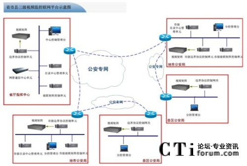 在省廳到地市之間配置視頻監(jiān)控聯(lián)網(wǎng)平臺中的核心管理調(diào)度單元、專用視頻終端、CS中心GIS控制客戶終端、邊界標準協(xié)議控制單元,地市核心管理調(diào)度單元、級聯(lián)矩陣控制中心單元、網(wǎng)管通信中心單元、中心音頻ACU調(diào)度單元、邊界標準協(xié)議控制網(wǎng)關、CS中心GIS控制客戶終端、通用型數(shù)字矩陣解碼陣列、通用標準控制矩陣鍵盤等組件構建省至地市級公安監(jiān)控聯(lián)網(wǎng)系統(tǒng)。
