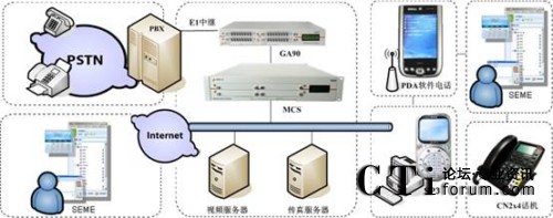 1)由MCS與該企業(yè)原有的大型傳統(tǒng)PBX進行對接,MCS主要處理語音交換,具備IP-PBX和VOIP網(wǎng)關的功能,還具有IVR(交互式語音應答)和ACD(自動呼叫分配)等呼叫中心功能,并為SEME提供服務。