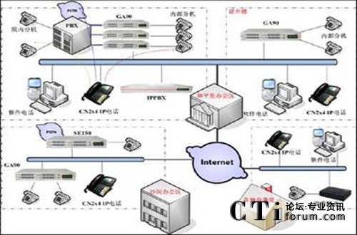 各地辦事處由于話務(wù)量比較少,所以只需要部署IP電話或小型網(wǎng)關(guān),即可與總部進(jìn)行免費的voip通話。