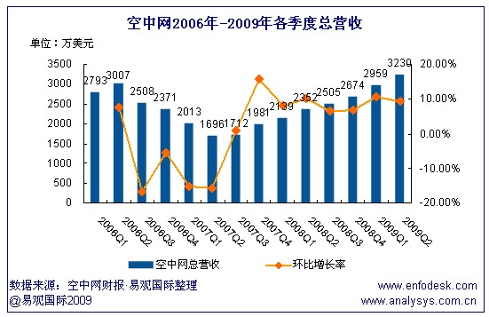 空中網(wǎng)發(fā)布了截至6月30日的2009年第2季度未經(jīng)審計財報。報告顯示,空中網(wǎng)第2季度總營收為3230萬美元,同比增長37%,比上一季度增長9%;按照美國通用會計準(zhǔn)則,空中網(wǎng)第2季度凈利潤為355萬美元,高于同年第1季度103萬美元。