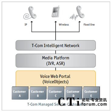 媒體平臺(tái)驅(qū)動(dòng)器提交了高功能性和投資保護(hù)。T-Com選擇VoiceObjects的一個(gè)主要考慮是一組媒體平臺(tái)驅(qū)動(dòng)器,它們作為VoiceObjects服務(wù)器和一百多個(gè)經(jīng)過(guò)VoiceObjects實(shí)驗(yàn)室認(rèn)證的媒體平臺(tái)之間的接口。通過(guò)VoiceObjects服務(wù)器,T-Com享受到了平臺(tái)廠商的無(wú)關(guān)性和應(yīng)用開(kāi)發(fā)工作的投資保護(hù),以及媒體平臺(tái)版本之間、媒體平臺(tái)廠商之間和標(biāo)志語(yǔ)言標(biāo)準(zhǔn)的版本之間(比如從VoiceXML