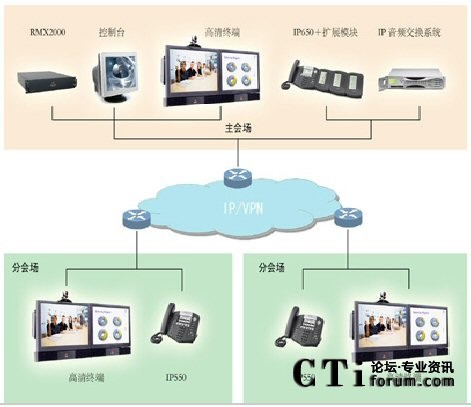 每個(gè)會(huì)場(chǎng)分配一個(gè)專用的IP地址,終端設(shè)置一部Polycom IP550電話, 在中心會(huì)場(chǎng)的指揮電話及擴(kuò)展模塊上設(shè)置每個(gè)分會(huì)場(chǎng)快速呼叫功能鍵,中心會(huì)場(chǎng)的管理人員只需按下IP650及擴(kuò)展模塊上的對(duì)應(yīng)于各分會(huì)場(chǎng)的快捷按鍵,即可迅速接通各個(gè)分會(huì)場(chǎng)。