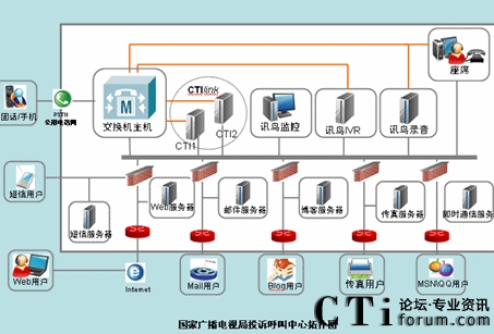 系統(tǒng)主要包含IVR服務(wù)器,CTI服務(wù)器,短信網(wǎng)關(guān),郵件服務(wù)器,傳真服務(wù)器,數(shù)據(jù)庫服務(wù)器,座席系統(tǒng)等?蛻魮艽蛱胤柎a接入廣電公司客服系統(tǒng),首先由IVR提供自動語音服務(wù)。CTI服務(wù)器負責所有的電話的路由、排隊、轉(zhuǎn)接和控制?蛻粼诮邮茏詣诱Z音服務(wù)時,如果需要人工幫助,可選擇轉(zhuǎn)入人工座席。由IVR系統(tǒng)向CTI發(fā)出轉(zhuǎn)接請求,完成轉(zhuǎn)接功能。