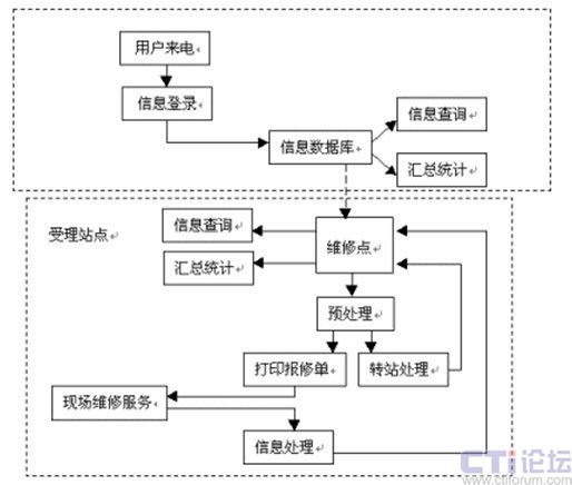 維修點(diǎn)對(duì)用戶(hù)的報(bào)修情況進(jìn)行預(yù)處理之后,根據(jù)用戶(hù)所在的區(qū)域,分配至最近距離的維修站,將用戶(hù)與其報(bào)修信息即時(shí)轉(zhuǎn)移,這也就是圖中所顯示的"轉(zhuǎn)站處理"。之后,維修站將直接打印出報(bào)修單,加快服務(wù)實(shí)施的效率、減少人工出錯(cuò)的比例,有專(zhuān)業(yè)人員及時(shí)上門(mén)服務(wù)檢修。