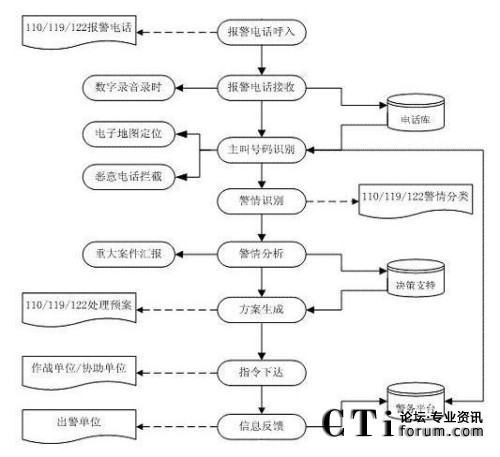 該系統(tǒng)主要分為電信子系統(tǒng)(完成聯(lián)動中心與各電信公司之間話音的傳輸、交換和分配,以及主叫號碼和主叫地址的自動查詢和傳輸?shù)龋、接警中心子系統(tǒng)(統(tǒng)一接聽和處理市民的報警、求助電話)、指揮調(diào)度子系統(tǒng)(或稱為處警中心,通過直觀的地理信息系統(tǒng)和數(shù)據(jù)庫,可以對所有的資源和警力分布了如指掌。通過一體化的無線數(shù)據(jù)傳輸和無線調(diào)度臺進(jìn)行方便的統(tǒng)一管理,指揮和調(diào)度)、信息網(wǎng)絡(luò)子系統(tǒng)(聯(lián)動中心的骨干網(wǎng)絡(luò),把各種數(shù)據(jù)數(shù)庫、接處警席位、移動的警用車載計(jì)算機(jī)等互聯(lián)在一起,形成一個強(qiáng)大的信息網(wǎng)絡(luò))、無線指揮調(diào)度通信子系統(tǒng)、大屏幕顯示子系統(tǒng)、地理信息子系統(tǒng)、GPS/GIS子系統(tǒng)。
