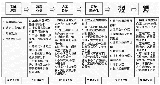 根據(jù)東風(fēng)設(shè)備廠作為傳統(tǒng)國營(yíng)制造企業(yè)的特點(diǎn),TurboCRM的實(shí)施顧問將系統(tǒng)實(shí)施分為實(shí)施啟動(dòng)(理念導(dǎo)入)、流程分析(業(yè)務(wù)梳理)、方案設(shè)計(jì)(流程固化)、系統(tǒng)初始化(系統(tǒng)部署)、培訓(xùn)認(rèn)證、啟用評(píng)估六個(gè)階段,步步推進(jìn)。