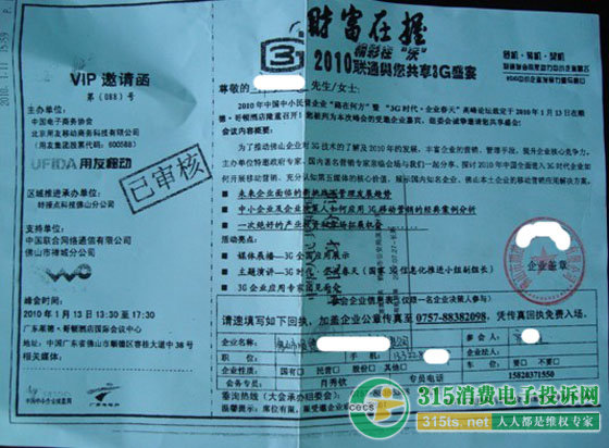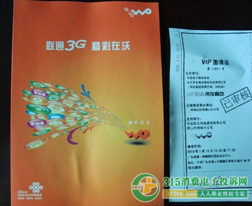會(huì)場(chǎng)到處都洋溢“中國聯(lián)通”的氣息。如現(xiàn)場(chǎng)有眾多中國聯(lián)通的3G宣傳廣告,且發(fā)的材料中還有一份是中國聯(lián)通的宣傳單,另外,會(huì)議現(xiàn)場(chǎng)甚至還有聯(lián)通3G手機(jī)銷售柜臺(tái)。種種情況讓齊先生等人更堅(jiān)定了他們參加的就是中國聯(lián)通組織的會(huì)議。