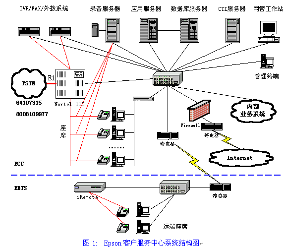 愛普生(中國)的客服系統(tǒng)采用數(shù)據(jù)集中與分散相結合、座席集中受理的方式進行建設。其中,所有設備均配置在北京,所有座席均在北京受理客戶服務請求,