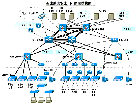 除以上三層之外,在塘沽電信局將建立一個(gè)數(shù)據(jù)中心,由兩臺(tái)Cisco Catalyst6509第三層交換機(jī)為數(shù)據(jù)中心提供數(shù)據(jù)交換及路由。接入的DSLAM設(shè)備,小區(qū)內(nèi)的樓層交換機(jī)及用戶(hù)前端設(shè)備(CPE)也屬于接入層。接入層主要為最終用戶(hù)提供多種寬帶接入方式。