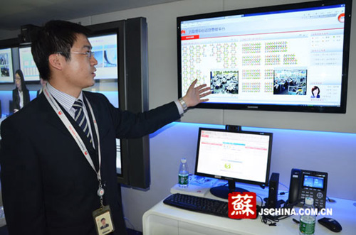 企業(yè)工作人員介紹先進的呼叫中心系統(tǒng)。