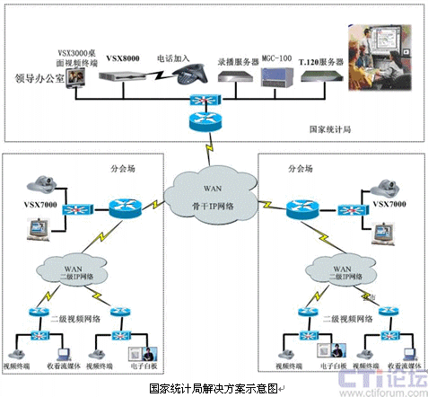 為確保如此巨大的視頻會(huì)議系統(tǒng)的應(yīng)用效果,視頻會(huì)議系統(tǒng)的各個(gè)設(shè)備全部采用POLYCOM公司的產(chǎn)品。寶利通(POLYCOM)公司依靠自身豐富的經(jīng)驗(yàn)、領(lǐng)先的產(chǎn)品和技術(shù)以及豐富的項(xiàng)目部署經(jīng)驗(yàn),結(jié)合國(guó)家統(tǒng)計(jì)局的實(shí)際需求,提出了全套的視頻會(huì)議系統(tǒng)解決方案,并最終憑借產(chǎn)品出色的視音頻質(zhì)量、良好的穩(wěn)定性和先進(jìn)的技術(shù)、以及出色的服務(wù)贏得了用戶(hù)的認(rèn)可,成功中標(biāo)國(guó)家統(tǒng)計(jì)局視頻會(huì)議系統(tǒng)項(xiàng)目.該系統(tǒng)可最大限度地發(fā)揮其現(xiàn)有IP寬帶網(wǎng)絡(luò)的優(yōu)勢(shì),加快對(duì)具體事件的處理速度,節(jié)約辦事人員的路途時(shí)間,最大限度地提高政府的辦公效率,降低辦公費(fèi)用。