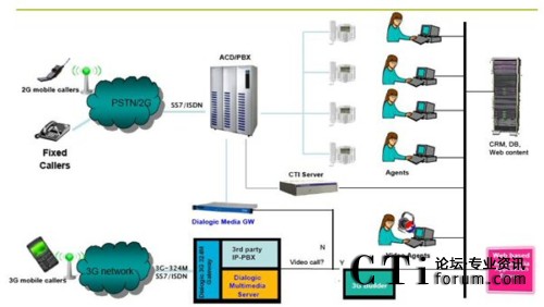 那么如何快速的實現(xiàn)3G IVVR的這些功能呢?林克海德愿意幫助您一起完成這項工作,基于Dialogic產品的全力支持,您可以實現(xiàn)web頁面到3G手機的視頻轉換,也可以與舊有的傳統(tǒng)呼叫中心(2G)互聯(lián)互通,快速建立一整套系統(tǒng)。您可以通過3G手機打到Dialogic視頻網(wǎng)關,再通過3G Bridge與web server連接,3G Bridge起的主要作用就是把web上的HTTP轉換成RTP\RTSP文件,這樣就完成了web與3G手機的互動,同樣的,如果您想和傳統(tǒng)的呼叫中心進行連接,只需要用Dialogic的媒體服務器接入舊有的ACD\PBX里,就可以把3G與2G 的平臺連接到一起,實現(xiàn)互聯(lián)互通。