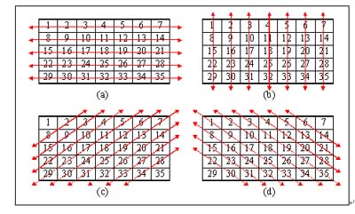 以對數(shù)據(jù)的位置重新排列方法,如圖1.1所示,假設(shè)其中的一個子圖皆為一張檔案大小5*7的圖文件,則在”位置重新排列”的方法中,其先對檔案數(shù)據(jù)作左右方向位置的調(diào)換,如圖1.1(a);再將經(jīng)過左右方向轉(zhuǎn)換的檔案數(shù)據(jù),作上下方向位置的調(diào)換,如圖1.1(b);再將經(jīng)過左右方向與上下方向轉(zhuǎn)換的檔案數(shù)據(jù),作右上左下方向位置的調(diào)換,如圖1.1(c);最后在將經(jīng)過前三個方向轉(zhuǎn)換的檔案數(shù)據(jù),作左上右下方向位置的調(diào)換,如圖1.1(d)。因此,其對于每一張圖檔都在四種方位上對數(shù)據(jù)作位置上的對調(diào),如此才完成一張圖檔的加密過程。并且在任何一個方向上,對數(shù)據(jù)作轉(zhuǎn)換的方向與點(diǎn)數(shù)都是不固定的,其完全依照隨機(jī)的方式,并有產(chǎn)生隨機(jī)方向與點(diǎn)數(shù)的機(jī)制。此種方法,僅針對檔案中的數(shù)據(jù)調(diào)換位置,即將數(shù)據(jù)位置作重新排列,此舉并不會改變到檔案中每一個數(shù)據(jù)內(nèi)容的值。