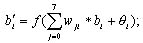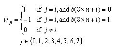 其中,函數(shù)f(x)代表,當(dāng)x≧0時,f(x)等于1;否則f(x)等于0。又其中的wji及θi均為bi的參考值,而其每一個bi的參考值其計(jì)算方法如下列式(1.3)及式(1.4)所示。