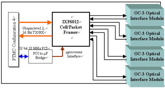 在這個(gè)例子中,Utopia總線是封包傳輸?shù)闹饕獢?shù)據(jù)傳輸路徑,PCI總線是用來設(shè)定與控制IXF6012,透過使用了PTMC,設(shè)計(jì)工程師可提供各種連接到網(wǎng)絡(luò)處理器的實(shí)體層更多彈性。
