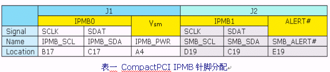 規(guī)范中定義了兩組IPMB總線,第二組IPMB總線是可選的,其內部的聯(lián)接是位于CompactPCI的J1及J2上,如表一所示: