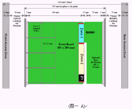 我們可以看到當今市面上已有相關的零件商或系統(tǒng)商開發(fā)出14U或13U,12U的ATCA機箱。就ATCA機箱的型式來說可以分為直立型插卡與橫向型插卡兩種類型。直立式插卡機箱的標準為14槽(參考圖一B),而橫向型機箱因受限于機箱高度,所以視其高度決定槽數的多少。 ATCA的架構主要包括以下部分:正面插槽,RTM,PEM,背板,CMMs,散熱系統(tǒng)。(參考圖一與圖二)