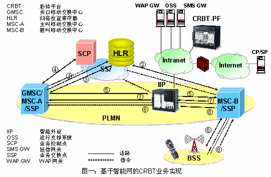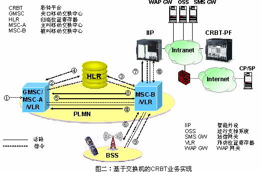 智能網(wǎng)方案對現(xiàn)有的網(wǎng)絡(luò)改動(dòng)較小,可以快速開展彩鈴業(yè)務(wù)。但是,在現(xiàn)有的智能網(wǎng)網(wǎng)絡(luò)條件下,該方案會(huì)造成話路迂回,占用過多的中繼資源;而且整個(gè)呼叫過程中都要占用CRBT-IP,容易造成話務(wù)負(fù)載過大,限制了CRBT業(yè)務(wù)的用戶數(shù)量。