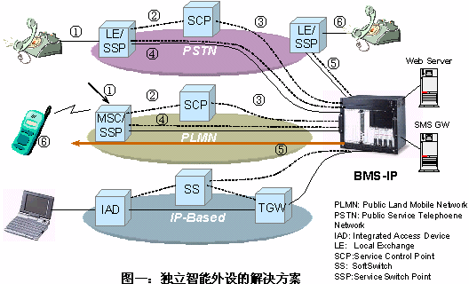 隨著智能業(yè)務(wù)的發(fā)展,智能網(wǎng)中獨立智能外設(shè)(IIP)的應(yīng)用越來越廣,其功能也得到了很大的增強,如:增加了部分業(yè)務(wù)邏輯功能以擴展SCP的業(yè)務(wù)邏輯、主動呼出功能、業(yè)務(wù)和用戶數(shù)據(jù)存儲管理功能,開放接口等。這種增強型IIP能滿足復(fù)雜的增值業(yè)務(wù)需要,提供有效的業(yè)務(wù)控制和網(wǎng)絡(luò)資源利用,代表當(dāng)前應(yīng)用的主流,已在一些業(yè)務(wù)中有了出色的表現(xiàn)。圖一是采用增強型IIP作為BMS平臺的原理圖。