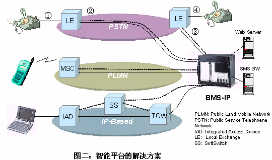 隨著通信發(fā)展,用戶對業(yè)務(wù)的多樣性、個性化和智能化的需求愈發(fā)緊迫。因此一種新業(yè)務(wù)在投入市場的時間,業(yè)務(wù)量和對現(xiàn)網(wǎng)設(shè)備改造等方面都提出了新的挑戰(zhàn)。智能業(yè)務(wù)平臺以分布接入、集中控制、業(yè)務(wù)擴展靈活,可快速實現(xiàn)各類電信增值新業(yè)務(wù)的突出優(yōu)點,滿足了人們對電信新業(yè)務(wù)的迫切需要。智能業(yè)務(wù)平臺投資小、見效快,是近年來實現(xiàn)增值業(yè)務(wù)的優(yōu)選方案。在固定和移動、電信和IT融合的發(fā)展潮流中,它具有很大的想象空間。用智能業(yè)務(wù)平臺實現(xiàn)BMS的工作原理如圖二所示。