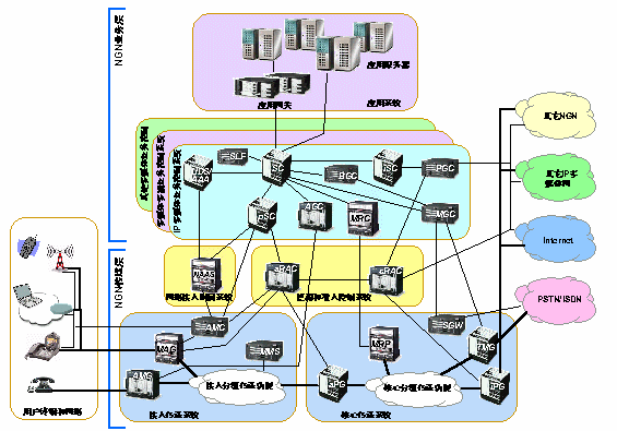 NGN網(wǎng)絡(luò)邏輯上可分為用戶(hù)網(wǎng)、接入網(wǎng)和核心網(wǎng)。網(wǎng)絡(luò)的管理界限將NGN劃分為一些不同的NGN域。接入網(wǎng)和核心網(wǎng)可在同一NGN域中,也可以屬于不同的域。域內(nèi)的網(wǎng)絡(luò)拓?fù)湫畔⒖梢詫?duì)外屏蔽。域和域之間的互通將通過(guò)網(wǎng)關(guān)來(lái)完成。NGN支持與現(xiàn)有的網(wǎng)絡(luò)互通,如電話(huà)網(wǎng)絡(luò)、蜂窩網(wǎng)絡(luò)、互聯(lián)網(wǎng)等。NGN還支持各種有"NGN意識(shí)"的用戶(hù)設(shè)備和現(xiàn)有的無(wú)"NGN意識(shí)"的終端,如模擬電話(huà)機(jī)、傳真機(jī)、ISDN終端等。這些互通都通過(guò)網(wǎng)關(guān)來(lái)完成。NGN的網(wǎng)關(guān)主要包括多媒體接入網(wǎng)關(guān)、接入媒體網(wǎng)關(guān)、中繼媒體網(wǎng)關(guān)、分組網(wǎng)關(guān)和信令網(wǎng)關(guān)。