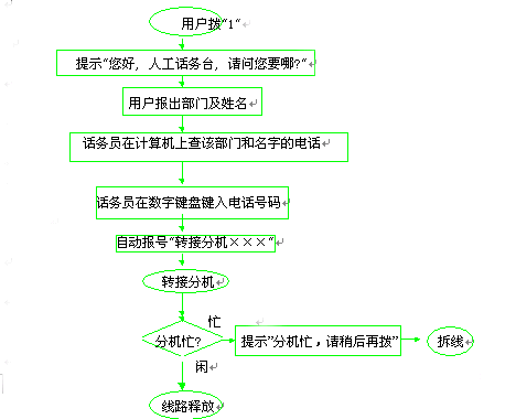 話務員不需要說話, 系統(tǒng)在所有必要之處都有提示音, 話務員只要在數(shù)字鍵盤上鍵入部門號"0××"和電話號碼"2××"。