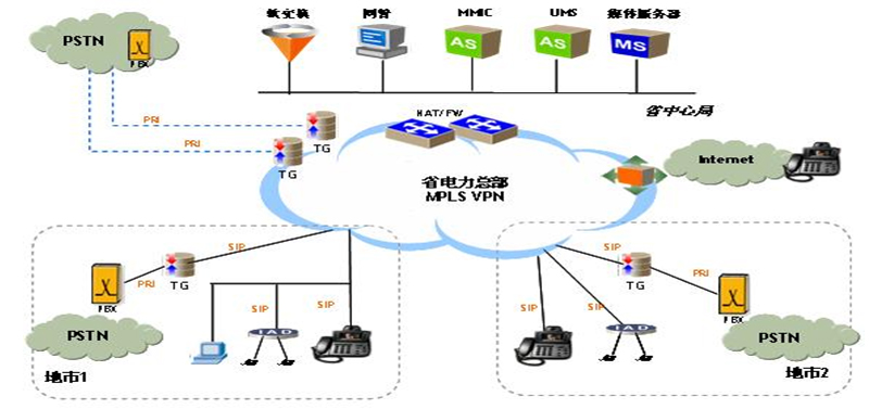 上海貝爾阿爾卡特的VoIP行業(yè)應(yīng)用解決方案可以幫助電力行業(yè)用戶提供可定制、可管理的VOIP增值業(yè)務(wù),包括IP Centrex、VPN、IP多媒體會議、Web 呼叫中心、一號通、Web800、統(tǒng)一消息、電子商務(wù)等多種業(yè)務(wù)。網(wǎng)絡(luò)拓撲圖如下: