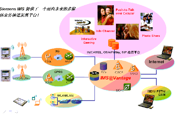 由于IMS與接入無關(guān)的技術(shù)特點(diǎn),IMS@vantage支持各種接入方式,如無線接入中的WLAN、GPRS、WCDMA/TD-SCDMA等,這些無線資源都能作為用戶接入技術(shù)與IMS系統(tǒng)連接。此外,西門子目前也實(shí)現(xiàn)了在固定接入方式下的多種應(yīng)用。