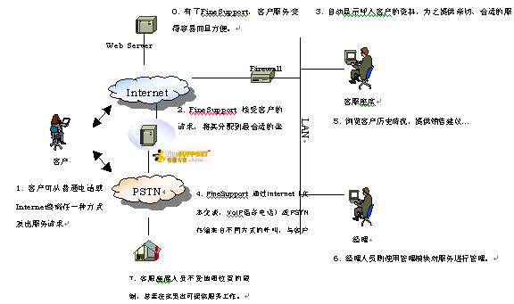 由于以上兩種原因,網(wǎng)通亟待開發(fā)新型的客戶服務平臺,既可用于解決客戶服務的需求,亦可作為開展增值業(yè)務的平臺。FineSupportIP呼叫中心產品是北極星軟件提出的主要基于IP架構的新型呼叫中心,除具備傳統(tǒng)呼叫中心的各項功能和以“電話”為主的接入方式之外,著重提供“Internet Call Center”或Web Call Center的服務,系統(tǒng)構建于網(wǎng)通IP網(wǎng)絡平臺上,將網(wǎng)通傳統(tǒng)業(yè)務和新型增值業(yè)務完美融合在起,成就中國網(wǎng)通公司“e時代基礎設施提供商”的定位。