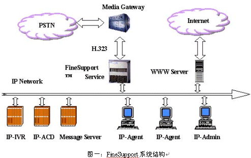 Finesupport是一個完全基于IP網(wǎng)絡(luò)的呼叫中心,不同于智能網(wǎng)應(yīng)用或CTI應(yīng)用。其應(yīng)用建立在Soft Switch體系之上,媒體流總是在第一時間被報文化,成為數(shù)據(jù)流,此后整個應(yīng)用系統(tǒng)中處理的完全是數(shù)據(jù),主要通過軟件來實現(xiàn),因而在降低成本、開展新業(yè)務(wù)、平滑升級方面具有極大的優(yōu)勢。